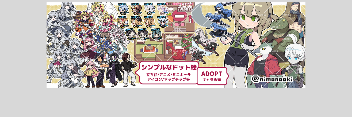 ご相談だけでも大丈夫ですので、メッセージからお気軽にお問合せください!(返信3日以内) ✨まずは下記のポートフォリオサイトをご一読いただけますとお取引がスムーズです =📢お知らせ(2/24更新)=== ■【⚠重要】「R18」及び「それに準ずるご依頼(全裸~半裸差分など)」はSKIMAでは対応できません。ご相談をいただいてもお返事いたしません。何卒ご了承下さい。 ■受付状況 2/24~ ご相談いつでも受付中です! ■価格改定のお知らせ 2026年6月頃から【200*200pxドット立ち絵】プランの価格改定を予定しております。 ■納期について 作業に充てられる時間が不規則なため、納期は「一律50日」としています (基本1点につき2~3週間で納品可能と思われますが、確約はできません) ========== ドット絵と筋肉、体格差が好き! 【ポートフォリオサイト】 https://nimono.moo.jp/00/ (2026/2/12更新) 過去の納品画像や作例サンプル、ご依頼についてのFAQなどを掲載しています! 【素材配布サイト】 ■BOOTH https://nimonooki.booth.pm/ ご依頼前に素材の使用感をご確認頂けます。 ーーーーー 《特に好みの属性/題材》 BL(腐向け), 短髪・筋肉男子, ムチムチ・巨乳女子, ケモノ ドット絵 (アニメーション対応可) レトロゲーム風 (特定の作品への絵柄寄せは不可) [▼◎当サイトで対応可] ・全年齢絵(ドット/非ドット) ・年齢制限なしの男男(BL)カップリング [▼×原則どこでも対応不可] ・版権絵 ・性別問わず低年齢の子のNSFW ・ 特定の作品への絵柄寄せ ・ 実在の人物の似顔絵や、モデルにしたイラスト 上記以外の傾向のご依頼もお気軽にご相談下さい! ーーーーー 【⚠️注意事項(ご依頼前必読)】 https://skima.jp/gallery?id=313703 (禁止事項/クレジット表記/ご連絡の時間帯/他) ご依頼頂いた時点で上記の注意事項に同意したものとみなします どうぞよろしくお願いいたします。
