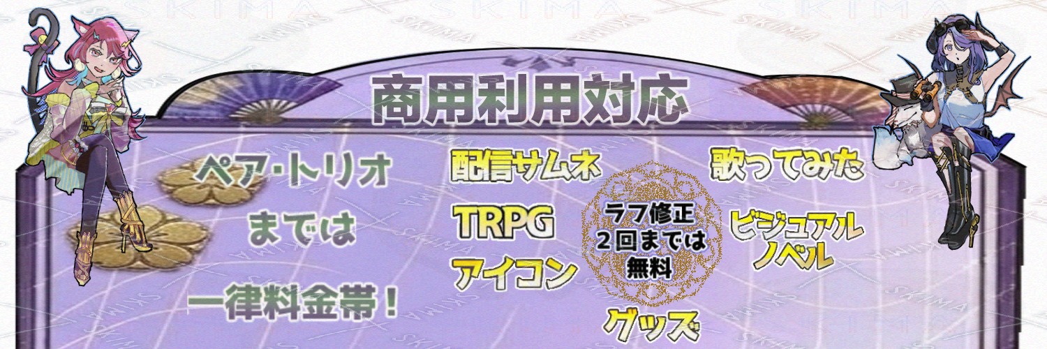 【出品準備中の為今しばらくお待ち下さい】 ご覧いただきありがとうございます。 変わらない魅力と、時代に合ったデザインを大切に制作しています。 人物のキャラメイク、表情差分など、SDキャラをメインに制作中です。 TRPGをはじめとする数々のゲーム、アイコン、歌みたなどの世の中のありふれる舞台を中心に+aなデザインを注がせてください!2Dデザイナーとしてお仕事する事を目標としています! かわいい系から少し個性的なデザインまで幅広く対応可能です。 初めてのご依頼でも安心して何でもご相談ください。 【デスク環境】 仕様ソフト:CLIP STUDIO PAINT 納品データ:jpeg/透過png/psd 【新規さまへ】 ・自作発言、転売、再配布、AI学習は禁止とさせていただきます。 ・こちらの作品をダウンロード、利用したことで起こったトラブル等は責任を負いかねますのでご了承ください。 実際に制作に設ける前にヒアリングをはじめとする納品までのお手伝いの流れの後に実際に形にうつします。 ここが揃わずに進行する事はまずないので安心して取り組めます。 なお、急を要する返信から3日を過ぎますと、不都合が重なった上でのキャンセル対応などの状況の場合以外で音沙汰がない場合に関しては、こちら側の力不足という事でおりさせていただきますので予めご了承ください🙇 【目安と無料修正】 日数は実際の仕事内容により変動いたします。 立ち絵:通常2週間〜1ヶ月 SDキャラ:1週間〜2週間 ※色ラフ段階での修正は2回目まで無料で行います。清書段階での大幅修正はさらに追加料金を頂戴します。 【お受けできない依頼】 ・エログロなどを含むR18関連 ・ファンアート※版権キャラなどのご要望 (細かくなりますがご依頼様が著作権を取り扱うかの詳細確認をする場合がございますが特例もあり) 【最後に】 商用利用料金は通常+3000のところ、今限り通常+1000でご対応。 実績作りキャンペーンでの特別な価格で提供致します。 今後のご案内は料金表や最新情報をギャラリーに掲載予定ですので、ぜひフォローを入れてご確認ください。