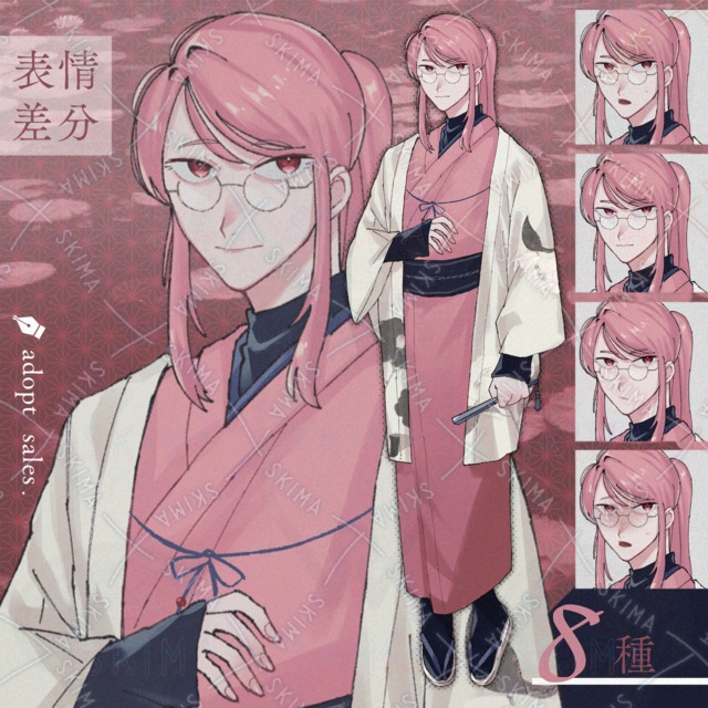 8 different expressions] Long hair, glasses and Kimono