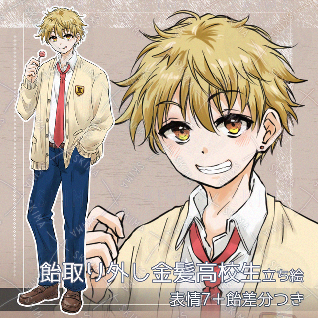 7 different facial expressions + candy ON/OFF] Blond high school boy removing candy / standing material