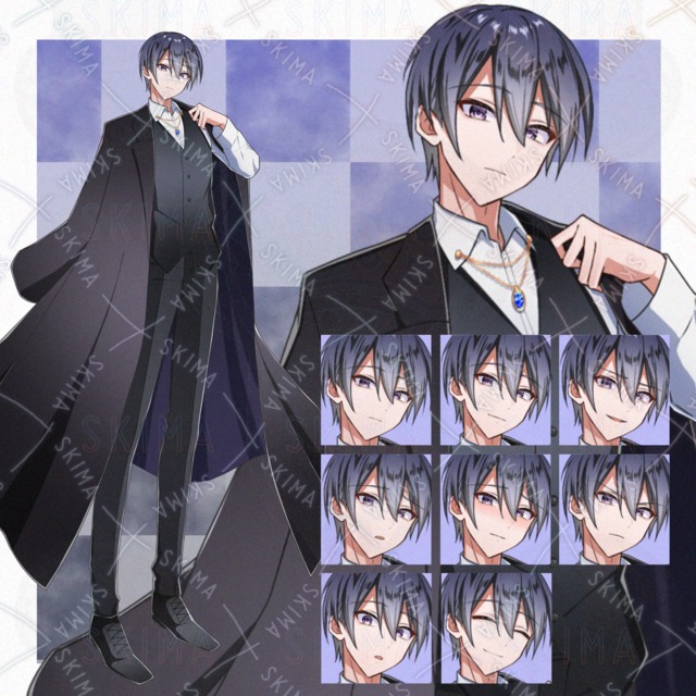 A boy with loose black hair and a black cat (10 different expressions)